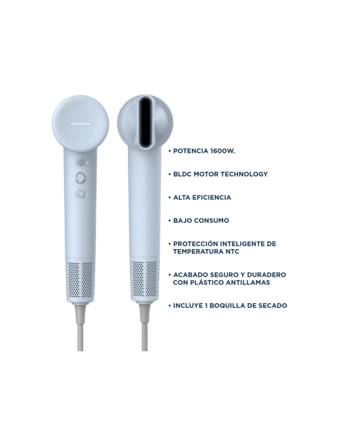 Características Principales: Potencia de 1600W para un secado eficaz en menos tiempo. Motor BLDC: alta eficiencia y larga vida útil sin fricción. 3 niveles de temperatura y función de aire frío instantáneo para cuidar tu cabello. Protección NTC que controla la temperatura y evita el sobrecalentamiento. Material antillamas y estructura resistente que priorizan tu seguridad. Diseño compacto, ligero y ergonómico, ideal para un manejo cómodo y prolongado.
